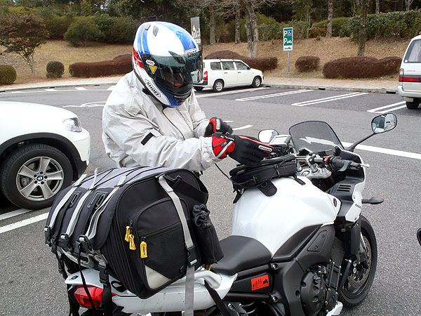 こちらは今回初参加のIKEHATAさん。これまでは主に2~300kmのツーリングを楽しまれているそうだが、今回初めてロングツーリング挑戦となった。スクリーンが小さいので寒そうだが、しっかりとグリップヒーターや電熱ウェアを装備。ん?結構万全な装備ではないですか。(^^;)
