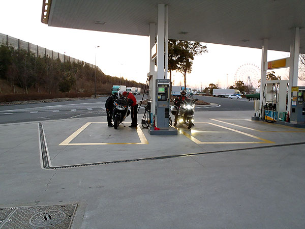 伊勢志摩YHから幹線道路までの急坂を慎重に下り、まずは給油を行った。今回航続距離の1番短かったIKEHATAさんのフェザー1000は既に燃料警告灯が点灯していたらしい。ツアラー系バイクは燃料タンクが大きめのためまだまだ余裕はあったのだが、念のため全員給油を行う。