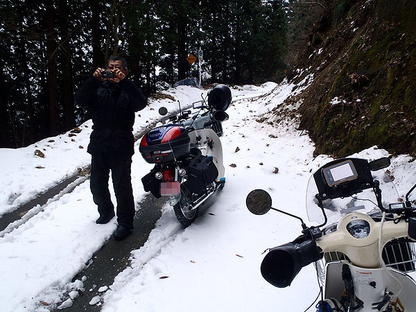 さて、シンさんは? と、噂していると期待通りシンさん(セロー)が到着しました。これで全員集合。この4台(4名)で雪道アタックとなります。