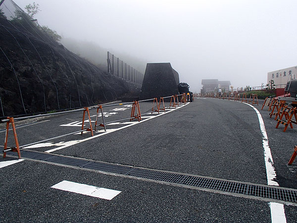 新5合目に到着。(10:57) バイクはバス乗り場横のこのスペースが専用駐車スペースとなっていた。あの落石事故以来変わったようだ。ここなら傾斜が無く大型バイクでも停めやすい。