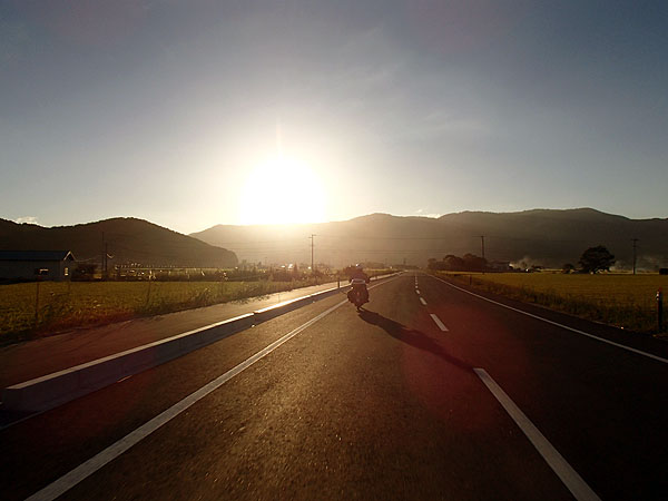 東北岩手県ツーリング2日目は眩し過ぎる程の朝日を浴びて始まった。2日目も絶好の天気である。(5:45)