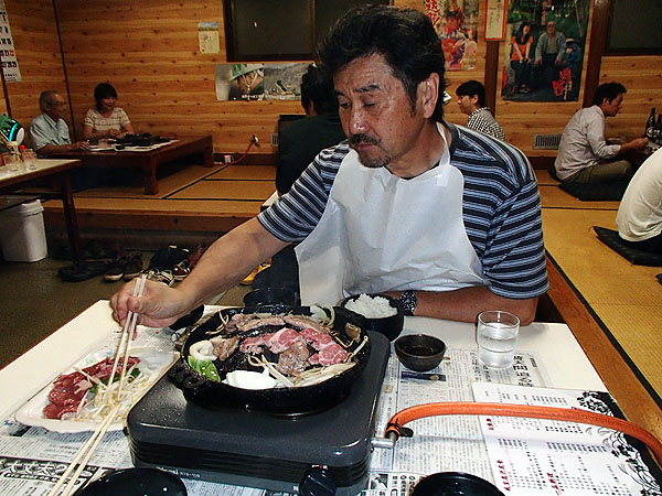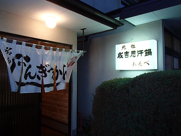 夕食は何と「ジンギスカン」。 ジンギスカンと言えば北海道と言うイメージがあるのだが、実は遠野がジンギスカン発祥の地とは知らなかった。食べに行ったお店はここ、「元祖じんぎすかん鍋 あんべ」だ。