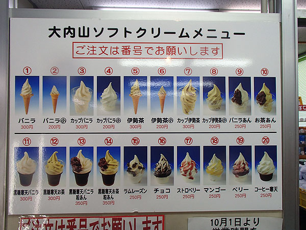 ここは大内山牛乳のお店でツーリングマップルにも紹介されている場所だ。ソフトクリームは結構種類が豊富。(^^) 私は②のバニラ(小)を食べた。