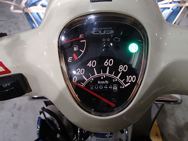 芋にぃちゃんさんのスーパーカブはガードレールまでそのまま押し付けられた様だ。前輪ホィールが変形し、右側クランクケース等も割れていたが、バイクは立ったままでエンジンも掛かったままの状態だった。エンジンが掛かったままだと、ガソリン等に引火する危険性があったので、キーをOFFにしてエンジンを止めた。