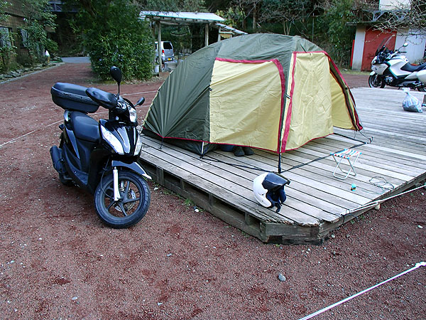 ところで猿さんは、寒い中、名古屋から原付二種スクーターでの参加。それもキャンプツーリングは初めてで荷物満載で来るらしい。(爆)