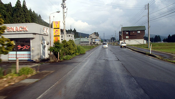 国道353号線を右折すると、晴れているにも関わらず、路面には水溜りが出来ていて、かなり強い雨が降っていたのが判る。前方は厚い雨雲に覆われている。