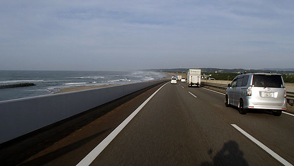 浜名バイパスでは走行中に海岸が見えましたが、日本に近づいている台風18号の影響で波が高かったです。風も若干強い感じでしたが、危険を感じる程では無かったです。