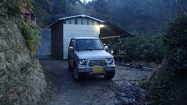 奥の小屋が私達が利用したロッジ(出入口側)です。手前は芋にぃちゃんのパジェロミニです。