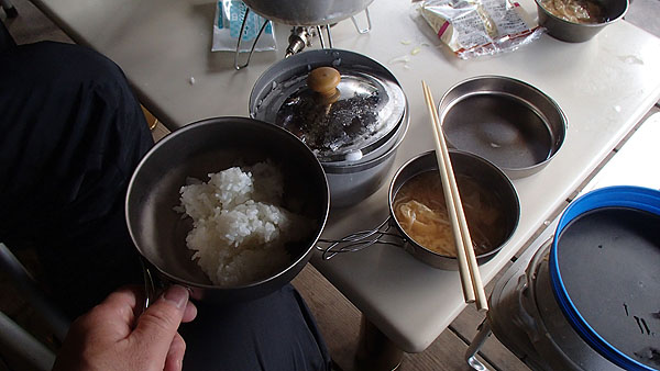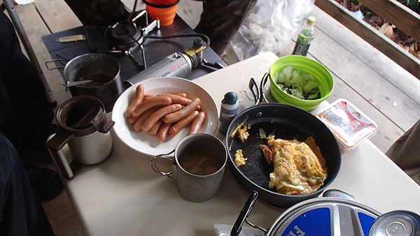 朝食の準備です。(7:06) しばらくするとYamaさん(R1200GS Rallye)と白ヤギさん(F800GS)が到着しました。
