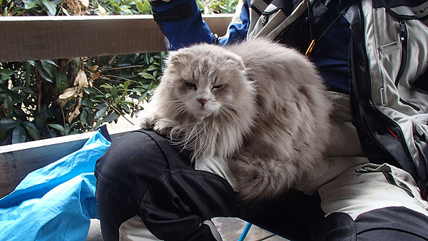 野良?それともこのキャンプ場の飼い猫でしょうか?しばらくうろうろした後、白ヤギさんの膝の上に勝手に乗り・・・。(笑)