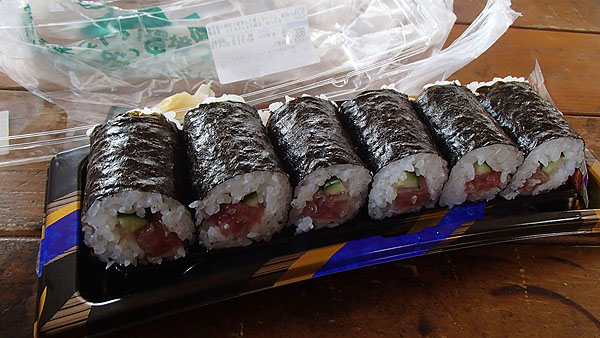 ありましたよ!安くて美味しそうな惣菜が!(笑) まぐろ中落ち中巻きが398円です。結構大き目ですね。これにマカロニサラダ(112円)や夜食のお菓子、翌朝の朝食も購入しました。