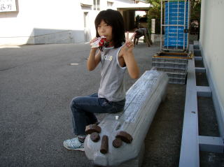 その後も結局国道20号線をひたすら走り、大月付近のローソンで2度目の休憩を取った。このローソンでは2人共アイスクリームを食べた。この頃は若干日差しが強く、丁度冷たい物が食べたかった。このローソンの駐車場には下の写真の様に丁度良いベンチが有った。これはとても重宝した。ライダーには本当に助かる。