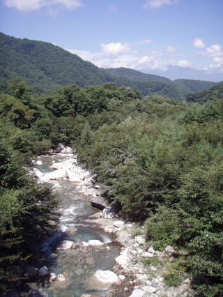 鈴蘭林道を抜けた所で左折し、舗装林道を青木鉱泉、御座石鉱泉方面に進み、小武川林道を目指した。 小武川林道までの区間は完全舗装路と変わり果て、昔見た景色は跡形も無くなっていた。以前川原に車で降りられた場所も、何処だか判らなくなってしまったのはとても寂しい気がする。 左の写真は鈴蘭林道と小武川林道の間にある橋の上から撮ったもので、この時見た川の水の美しさは以前と変わらずホッとした。(11:38) 小武川林道に入ると、また所々フラットダートとなる。 そして小武川林道終盤の橋の下で川原に降り、休憩を兼ねて水遊びをする事にした。(12:00) |