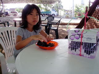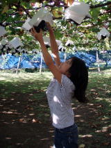 結局数件農家を巡り聞いてみてぶどう狩りしか出来ないと判ると、娘は「ぶどう狩りで良いからしたい」と言いだした。結局「イチフル」さんと言う農園でのぶどう狩りを行った。 ところで、ここ最近ぶどう狩りの体験が多くなり、今迄色々教えてもらった美味しいぶどうの選び方をまとめてみました。(巨峰の場合) 1.ぶどうの房の茎がぶら下がる横の茎が茶色になっている事。 2.ぶどうの房自体の大きさより、一玉一玉の大きさが大きい事。そして丸い事。 3.陽に透かし、特に黒いのを選ぶ事。 以上です。ぶどう狩りされる方はご参考にして下さい。 |