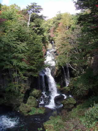 中禅寺湖周辺はまだまだ紅葉している感じは無かった。それでも天気が良いせいか、結構観光客で賑わっていた。そしてまず立ち寄ったのが「竜頭滝」である。(11:40) ここは紅葉の名所としても有名であり、日光でも早くから見頃を迎える場所で有名だ。(左写真) しかし、予想通りここも紅葉の見頃はまだまだ先のようだ。紅葉の見頃は2週間後の10月中旬位だと思われる。