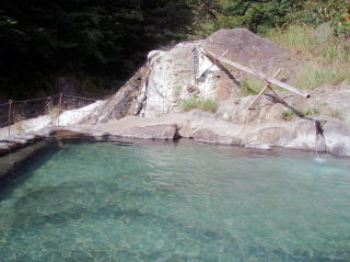 肝心の温泉は脱衣所の奥と手前の2箇所に別れるが、お勧めは一番奥の大露天風呂である。(写真) この一番奥の露天風呂は結構お湯が熱めであり、その横にはちょっとした岩で出来た洞窟が有り、中には御神体が祭られ(?)ている。(^^;) そしてその洞窟の中にも温泉が沸いており、とても長い時間は入っていられないほどの熱さだった。