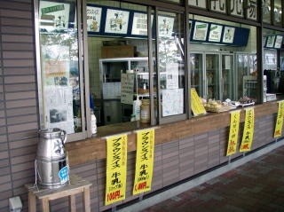 霧降高原道路入口に到着すると、大笹牧場の施設が目に入り立ち寄った。(14:55) 入口付近にはバイク専用の駐車スペースも有り、立ち寄るには都合が良い。ここでは「ブラウンスイス牛乳」と言う牛乳が売られていた。(コップ1杯 100円) 甘みが有り美味しい牛乳だった。 レストハウス内にはお土産が沢山売られており、その中でも色々なチーズが試食販売されていて、勿論一通り食べてみた。どれもこれも美味しかったが、要冷蔵と言うのが気になり結局お土産は買わなかった。