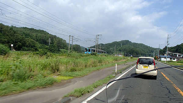野辺地付近でも電車と遭遇。(11:55) 実はこの前に、日中にも関わらず、道のすぐ横をニホンカモシカが飛び跳ねて向かってくるのと遭遇し、ぶつかるのではないかと心配する場面がありました。(^^;)