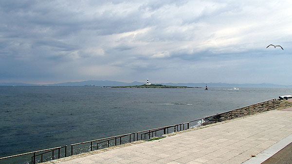 食べ終わり、外に出てもまだ明るかったので散策です。(17:58) 対岸に北海道の大地が見えます。