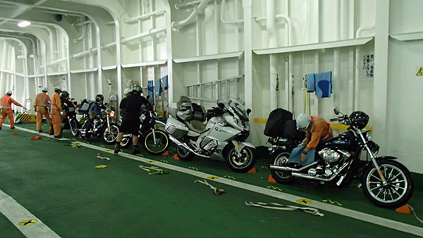 乗船は6:15頃に始まりました。フェリー内の固定用のアンカーは突起物が少なくなり、大型バイクでも乗船し易くなりましたね。(^^)