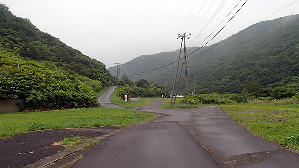 雨が止み、取りあえずキャンプ場から出発する時に、どうしても走らなければならない林道を事前に下見しました。下の写真は1番きつい坂を上から撮った写真です。見通しが利かないカーブであり車も通る道ですので、こんな場所で対向車と鉢合わせとなったらと思うとゾッとします。