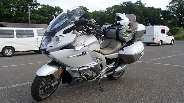 こちらがキャンプ道具を積載した私のK1600GTL Exclusiveです。今回はソロツーリングなので、リヤシートの上にロールバッグを積載しています。