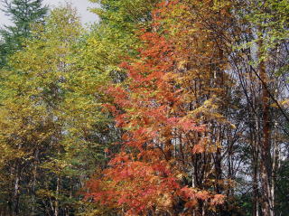 そんな大混雑の峠でも、バイクならトイレ前にも一時的にバイクを停める事が出来トイレを済ました。峠は風も強く紅葉した木々も大きく揺れていた。寒いので直ぐに長野県側のダート走行に向かう。長野県側はバイクならオフ車でなければ絶対に走行不可能と言いきれる荒れた道となる。 いざ走り出しても非常に緊張感を伴う走行だ。 そんな中でも時折非常に美しい紅葉が目に留まり、バイクを一時的に停めては写真を撮った。ちなみにバイクに跨ったままでの撮影である。 本当なら今回GIVIのトップケースに無理矢理詰め込んできたコンパクトバーナーを取り出し、道端で温かいコーヒーでも飲みながらゆっくりと景色を楽しみたいところだが、娘は寒くてそれどころでは無いらしい。可愛そうなのでひたすら山を下った。
