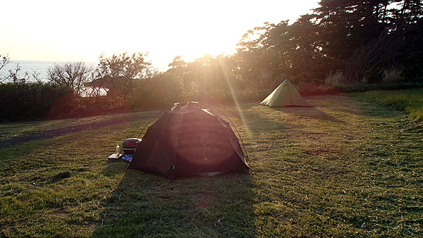 でも、このキャンプ場は快適で、運が良ければ夕陽や月夜、星空も堪能出来ます。ちなみに今回は正に運が良かったと実感出来ました。下の写真のテントはここで知り合ったライダーの方のテント。写真が趣味で一眼レフで夕陽や星空を撮影していました。ちなみに夕食時はご一緒し、サバなどご馳走を頂きました。ありがとうございました。とても楽しい時間を過ごせました。