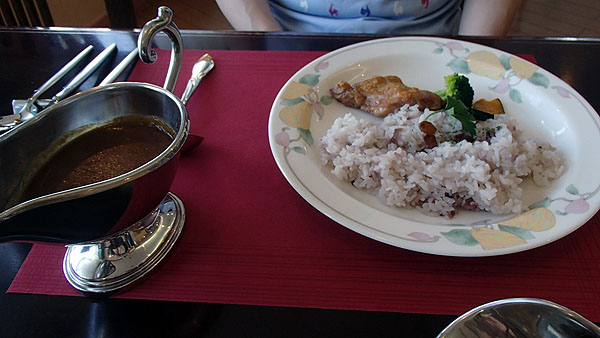 私が食べたのは「花畑のビーフカレー 夕焼けライスセット」(1,944円)、めぐは「越の鶏のチキンカレーセット」(1,512円)です。ここではカトラリーアイテムを自由に選択出来、めぐはノーベル(山崎金属工業株式会社)と言う、ノーベル賞授賞式の晩餐会で使用されているものを選択。私は「月桂樹(Laurel)」(燕物産株式会社の銀メッキ 洋白銀器式)を選択しました。