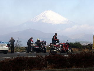 小田原厚木有料道路から箱根ターンパイクに入った。ターンパイクは上り切るまで雲りがちで寒さを一段と感じたが、上り切ると十国峠付近では富士山側のみ晴れていて富士山の勇姿が良く見えた。 富士山の勇姿を写真に撮ろうとして多くの人が富士山の良く見えるPAに車を停め写真撮影を行っていた。走行中、富士山手前の芦ノ湖に、逆さ富士も見える場所も在った。 私の持っているデジカメは簡単な物でスナップ程度しか撮れないが、一応景色の良さそうな撮影スポットでバイクを停め、一眼レフで撮影している人の横で写真を撮ってみた。やはりこう言う時はしっかりした一眼レフのデジカメが欲しくなる。