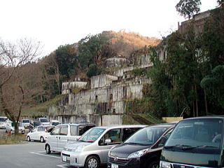 ← 「百笑の湯」駐車場前のコンクリートの壁は、昔は金の採掘場だった場所との事