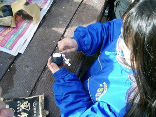 大涌谷の駐車場には少し大きめの残雪の山があり、予想通り娘が目の色を変え突進する。(^^) 手袋を濡らさないうちに先を急ぐことにした。売店の横を通りちょっとした上り坂を進む。すると硫黄の匂いがしてきた。そして大涌谷の最上部に到着。娘は大喜びであちこちを走り煙の出ているところを見たり温泉の溜まっているところをみたりして珍しがっていた。ここでも富士山が良く見え、観光客が代わる代わる富士山をバックに写真を撮っていた。
