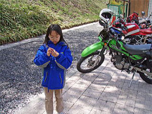 次の休憩は道の駅「あしがくぼ」に立ち寄った。この場所は多くの車やバイクが立ち寄り大混雑状態だったが、バイクは歩道に乗り上げる形で難無く駐車が出来た。ここでは桜が満開状態で、都心ではすっかり葉桜なのに桜吹雪が舞っていて春を実感させる風景を楽しめた。ひかりは落ちてくる桜の花びらを追ったり、小川で虫を探したりして楽しんだ。
