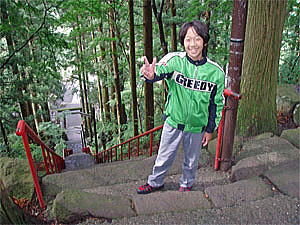 中之嶽神社へ続く急な階段は余裕で制覇の大貴。