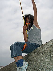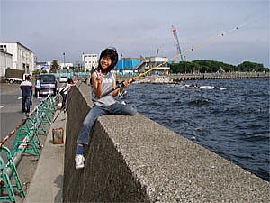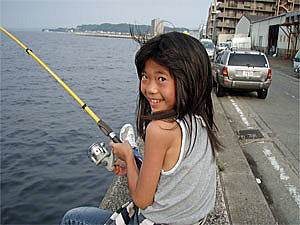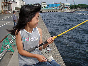 私はあかりにリールや仕掛けのセットの仕方や疑似餌の付け方を教え、実際にあかりにやらせて釣りを開始した。1投目。見事に右隣の人と糸が祭り状態となる。(隣の人は1人で3本もの竿で釣っていた。)申し訳ないと謝り少しだけもう少し左側に場所を離れて釣り再開。
