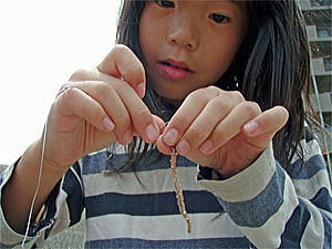私も一大決心をしてとうとうジャリメを掴む。 指先に徴妙な感触を感じながらも複雑な思いで何とか釣針に餌を付ける。考えてみれば30年以上振りの体験だ。釣り針をジャリメの口の中に刺し込もうとするが、まるで怪獣の様な顔付きで暴れキバも見える。(う〜ん・・・気持ち悪い・・・)