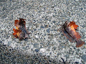 しかしこの魚、小さくて一見愛嬌の有る魚にも見えるが良く見るとかなりグロテスクな形をしている。色も毒々しい赤く濃い色だ。何となく直接触ってはいけない気配がするので先程頂いたおしぼりを使って魚を掴んだ。実はこれが大正解。後で知ったのだがこの魚、「ハオコゼ」と言う毒魚だそうだ。私は何も知らずに一生懸命釣り針を取ろうとするが、奥深く飲み込んでしまっている。しかもこの魚余程食い意じが悪いらしく、今まで釣った魚は釣り針を取ろうとすると大抵口を開けるのだが、口を真一文字に閉じたまま絶対にえさ(釣り針)を離そうとしないのだ。仕方無く近くで釣りをしている人に針外しを借りて何とか外したが、もし触っていたらハブの18倍もの毒を持つと言われるこの魚のせいで1ヶ月間は激痛に悩まされるハメになっていたかも知れない。(^^;)