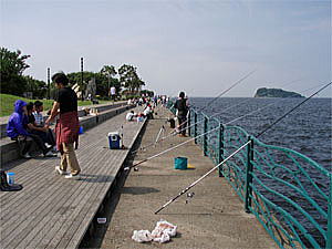 昼食後は釣り場を替えて先程の釣りをしていた防波堤から見えていた「海辺つり公園」に場所を移す。後で知ったのだがここは入場料無料の釣り場で防波堤での家族釣りでは人気のスポットらしい。 釣りを楽しんでいる人が大変多くかなりの混雑振りだった。釣れている魚も先程の私達とは違い、食べられそうな魚が良く釣れている。但し、釣り餌はジャリメではなくオキアミを使用したサビキ釣りがメインだった。