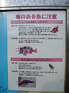 釣りは餌が無くなった時点で終わりにした。「海辺つり公園」で手を洗い身支度を整えていると、「毒のある魚に注意」と書いてある注意書きポスターを発見する。ここで初めて私達が釣っていた赤い魚の名前が「ハオコゼ」と知り、触ると大変なことになっていたと初めて知った。