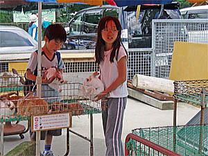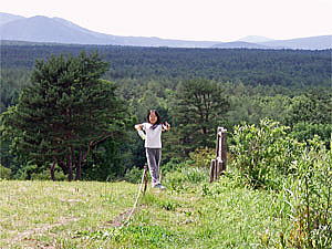 そして動物広場に到着。(12:35) ひかりは期待していた場所にやっと到着したので喜んで早速ウサギに触れられるコーナーに行く。最初は恐る恐る遠慮深げに撫でるだけであったが、その内慣れてくるとやっと抱き上げたりする様になった。ここではその他にソフトクリームを食べたり、丘の上に登って景色を見たりと楽しんだ。浅間山もしっかり見え、これから向かう志賀高原方面の山々もハッキリと見えた。