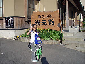 目標としたのは小布施温泉の「穴観音の湯」だ。途中に在る大滝温泉も良いなと思ったが、ひかりがどうしても「穴観音の湯」が良いと言うので通り過ぎる。しかし、山田放場から7km程走った所でひかりがタオルを忘れた事に気付き、キャンプ場まで引き返した。これが大幅な時間ロスとなり、一気に時間的に余裕が無くなってしまった。タオルを取り、再度「穴観音の湯」を目指したが、ひかりに「今日は別の近い温泉に入って穴観音の湯は明日にしよう!?」と話すと、最初は「でも穴観音の湯に行きたい!」と言ってはいたが、結局諦め途中で見掛けた日帰り入浴が出来る「湯元館」に入る事にした。