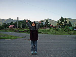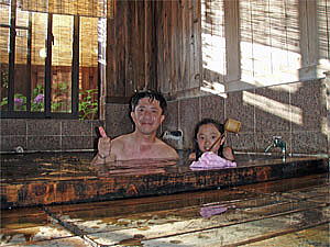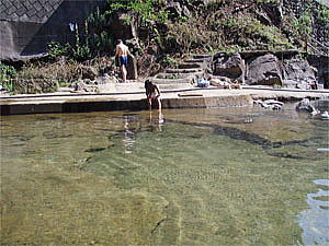 川底が滑り易いので慎重に川に入る。湯温は結構高めである。でも、火傷する程熱い場所はない。しかしひかりは足先だけ川に入れ、中々入ろうとはしなかった。理由を聞くと日差しが強く暑いのでもっとぬるいのに入りたいと言う。そこで日影の所で入ればと教えるとやっと川の中に入った。