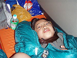テントに入るとひかりは少し寒かったらしくシュラフ(寝ぶくろ)に入った。シュラフはダウンが入ったものを持って来たので、シュラフに入ってからは暖かくて寒くはなくなったそうだ。