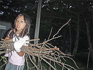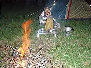 こうして夕食を済ませ、今度は焚き火用の枝集めとなった。幸いこのキャンプ場は直火OKでキャンプ場内には焚き火に使えそうな枝が一杯落ちていた。2人で一生懸命集め、日が暮れる前に焚き火を開始した。