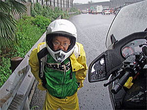 でも、既にびしょ濡れで手遅れ状態であった。丁度新座料金所を通過したので左端に寄りバイクを止めた。まずはひかりのレインウェアを慌てて着させる。そして自分もついでに着る。